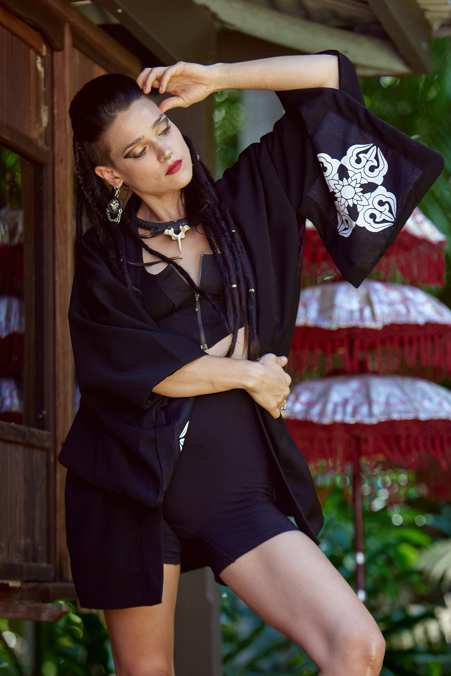Bespoke, hand made, hand stitched garments of intention The outer is fine Italian wool the inner lining is cotton The Symbol on the back of your kimono is "Ai" the Japanese character for love and affection On the sleeves you will find the Kamon or crest of a Japanese clan from the Kamkura period 1185-1300 The Symbol is the Katsuma Kongo, a fascinating fusion of Hindu iconography & the principles of esoteric Buddhism You see before you a three pointed spear, the spear of Kali goddess of rebirth & destruction. Each point of the spear represents one of the tree great mysteries Word - Thought - Action The spears are arranged pointing North, South, East & West. This arrangement is indicative of more than just physical direction, it is representative of all places as well as all times An infinite moment Combined as they are on this garment you have the symbology that offers a powerful and undeniable intention. Love in Word, Thought & Action in all spaces for all time. Wearing your Kimono will draw love to you and flow from you in Word, Thought & Action